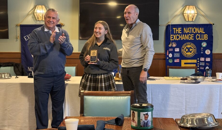 Maggie was celebrated at the Exchange Club's weekly breakfast, where she received her award from Skip Schoettmer '65 and members of the Exchange.