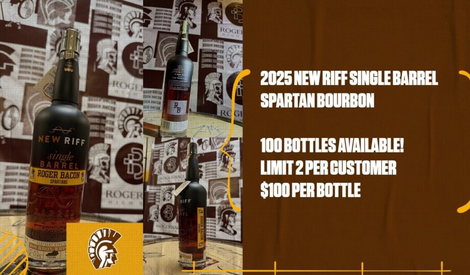 Spartan Nation, the Roger Bacon holiday bourbon release is back again! We had an another incredible opportunity to purchase a barrel of New Riff Single Barrel Bourbon. New Riff is a local distilling company located in Newport, Kentucky. The tasting panel tasted 5 different barrels during the selection process. We ended up choosing a barrel that we thought a bourbon aficionado and a casual bourbon drinker would love. Below is the description from New Riff on this particular single barrel: